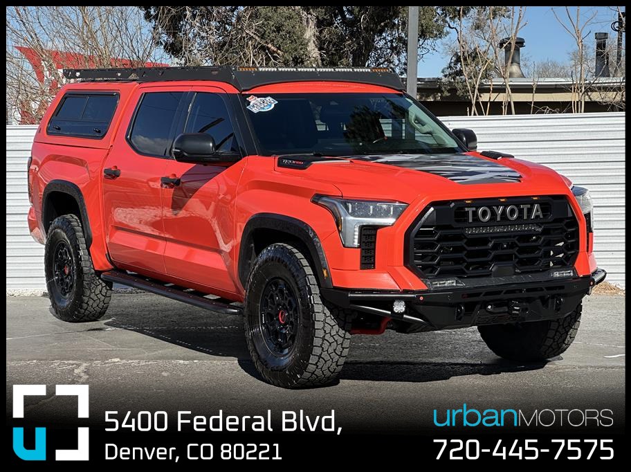 2023 Toyota Tundra Hybrid TRD Pro 4WD in Solar Octane. No Engine Recalls! 1 Owner. Paint Matched Leer Topper. Icon Lift Kit w/ Reservoirs + Upper Control Arms. 37" Toyo A/T Tires. CBI Steel Front Bumper w/ Warn Winch. Sherpa Full Roof Rack w/ Light Bar. RCI Rock Sliders. RCI Skid Plates. Locking Differential. Apple CarPlay & Android Auto. Leather. Cooled & Heated Seats. Heated Steering Wheel. JBL Sound System. Panoramic Sunroof/Moonroof. Toyota Safety Sense: Adaptive Cruise Control, Lane Assist & Pre-Collision Warning. Parking Sensors. 360 Degree Back-Up Camera. Bluetooth. Push-Button Start. Steering Wheel Controls. Touchscreen Navigation. USB/AUX Input.