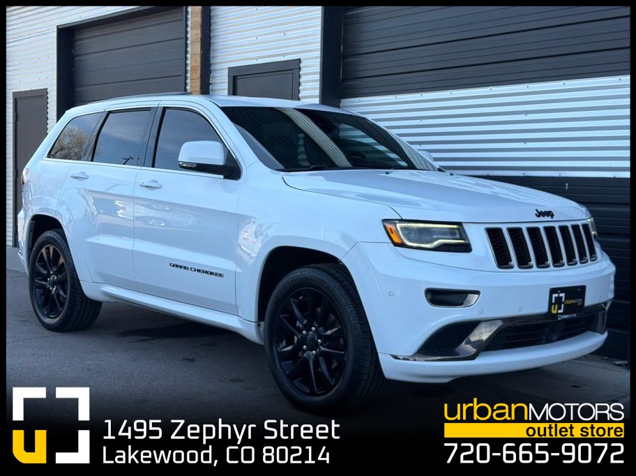 2016 Jeep Grand Cherokee High Altitude 4WD. Touchscreen. Panoramic Sunroof/Moonroof. Remote Start. Push Button Start. Power Windows/Locks. Parking Sensors. Navigation. Leather. Keyless Entry. Hitch. Heated Steering Wheel. Heated & Cooled Seats. Cruise Control. Bluetooth. Back Up Camera. AUX Input. Discover the perfect combination of luxury, performance, and advanced technology with this 2016 Jeep Grand Cherokee High Altitude in pristine white. With just 99,846 miles, this 4WD SUV is powered by a robust 3.6L V6 VVT engine paired with a smooth 8-speed automatic transmission, delivering both power and efficiency for city streets or rugged terrain. Step inside to experience premium comfort with dual heated and ventilated leather power seats, a panoramic dual-pane sunroof, and a host of cutting-edge features like Adaptive Cruise Control, Blind Spot Monitor, Lane Departure Warning, and a comprehensive Collision Avoidance System—designed for your peace of mind. The Advanced Technology Group packs this Grand Cherokee with navigation, a Harman Kardon premium audio system, Uconnect connectivity, and SiriusXM satellite radio to keep you entertained and connected on every journey. Safety and convenience are paramount with ParkSense park assist, ParkView backup camera, rear parking sensors, keyless entry/start, remote engine starter, and towing package ready for your adventures. Oversized premium 20"+ wheels, Bi-Xenon headlamps, fog lights, and stylish rear spoiler add to its commanding presence. Urban Motors Yellow in Denver invites you to experience this impeccably maintained, feature-loaded SUV that blends capability, style, and sophistication seamlessly. Don’t miss out—make this impressive Jeep Grand Cherokee High Altitude yours today!