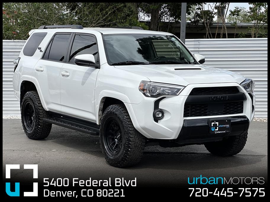 Discover adventure and reliability with this 2018 Toyota 4Runner TRD Off-Road Premium in striking white, now available at Urban Motors Blue in Denver, CO. Powered by a robust 4.0L V6 engine and equipped with a capable 4WD drivetrain, this 4Runner is ready to tackle both city streets and rugged trails with confidence. With 90,904 miles, it's been well-maintained and comes loaded with premium features like heated synthetic leather seats, a power sunroof, and a navigation system to keep you comfortable and connected on every journey. Enjoy peace of mind with advanced safety options including multiple airbags, stability and traction control, downhill assist, and a backup camera. The towing package and oversized off-road tires make this vehicle perfect for your outdoor gear and camping trips. Stay entertained with Bluetooth wireless connectivity, SiriusXM satellite radio, and a premium sound system. This 4Runner combines rugged off-road capability with luxurious touches—moon roof, power liftgate, running boards, and roof rack—ensuring versatility without compromise. Don’t miss your chance to own a dependable and stylish SUV that’s built for both work and play. Visit Urban Motors Blue to