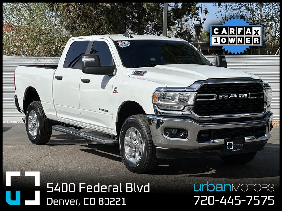 Discover rugged capability and refined comfort with this 2024 Ram 2500 Crew Cab Big Horn Pickup, now available at Urban Motors Blue in Denver, CO. With just 69,214 miles, this powerful 6.7L Turbo Diesel 6-cylinder truck combines strength and efficiency, paired with a smooth 6-speed automatic transmission and dependable 4WD for superior performance in any terrain. This striking white Big Horn is loaded with premium features including an Off-Road Package, Cold Weather Group, and Towing Package, making it perfect for both work and adventure. Enjoy modern conveniences like a backup camera, Bluetooth wireless connectivity, Uconnect system, keyless entry, push-button start, and power-adjustable heated mirrors. Safety is paramount with ABS, multiple airbags, park assist sensors front and rear, hill descent control, and stability and traction control. Plus, the durable bed liner and running boards add practicality and style. Experience the perfect blend of toughness and technology — a reliable workhorse that's ready to tackle your toughest jobs while keeping you comfortable and connected. Visit Urban Motors Blue today and drive home this exceptional Ram 2500 Big Horn!